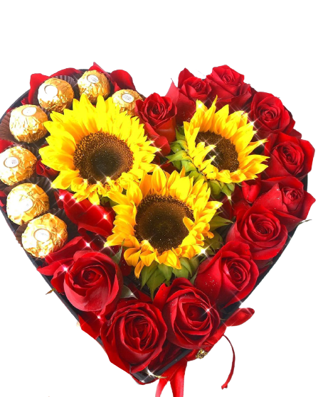 Elegante box en forma de corazón con 10 rosas rojas, 3 girasoles y 7 bombones Ferrero Rocher