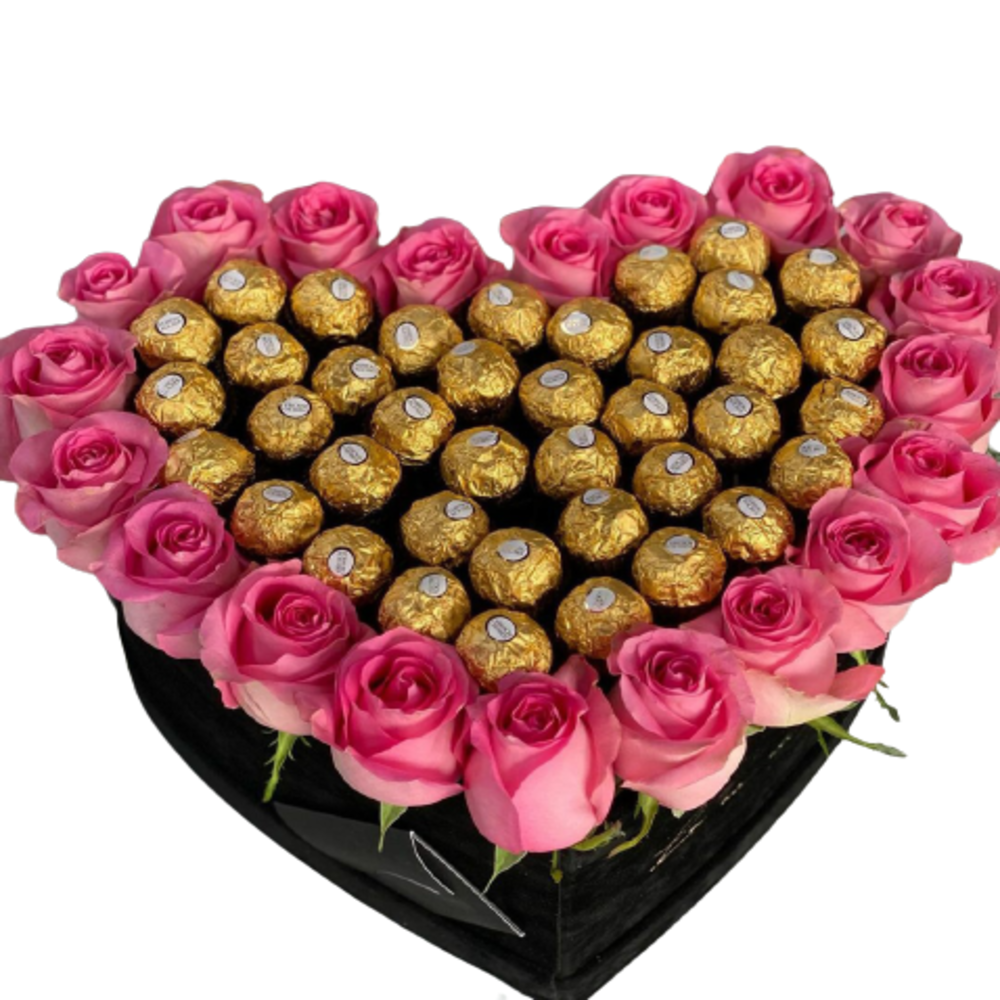Sorpréndela con esta espectacular caja de corazón con 15 rosas en color rosado y 16 ferrero rocher. La caja que abarca las Rosas son de elegantes terminaciones de cartón color blanca/negra/roja/rosa,, sujetada con una hermosa cinta santín roja.