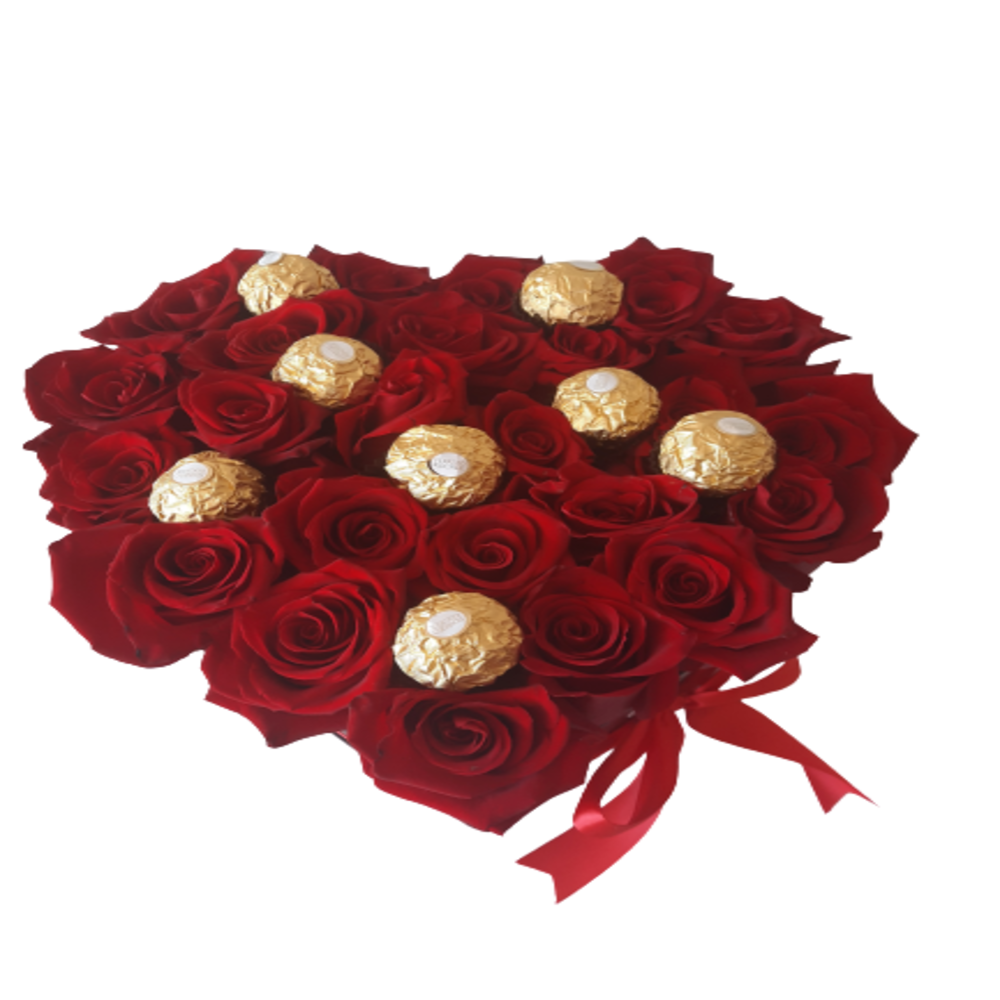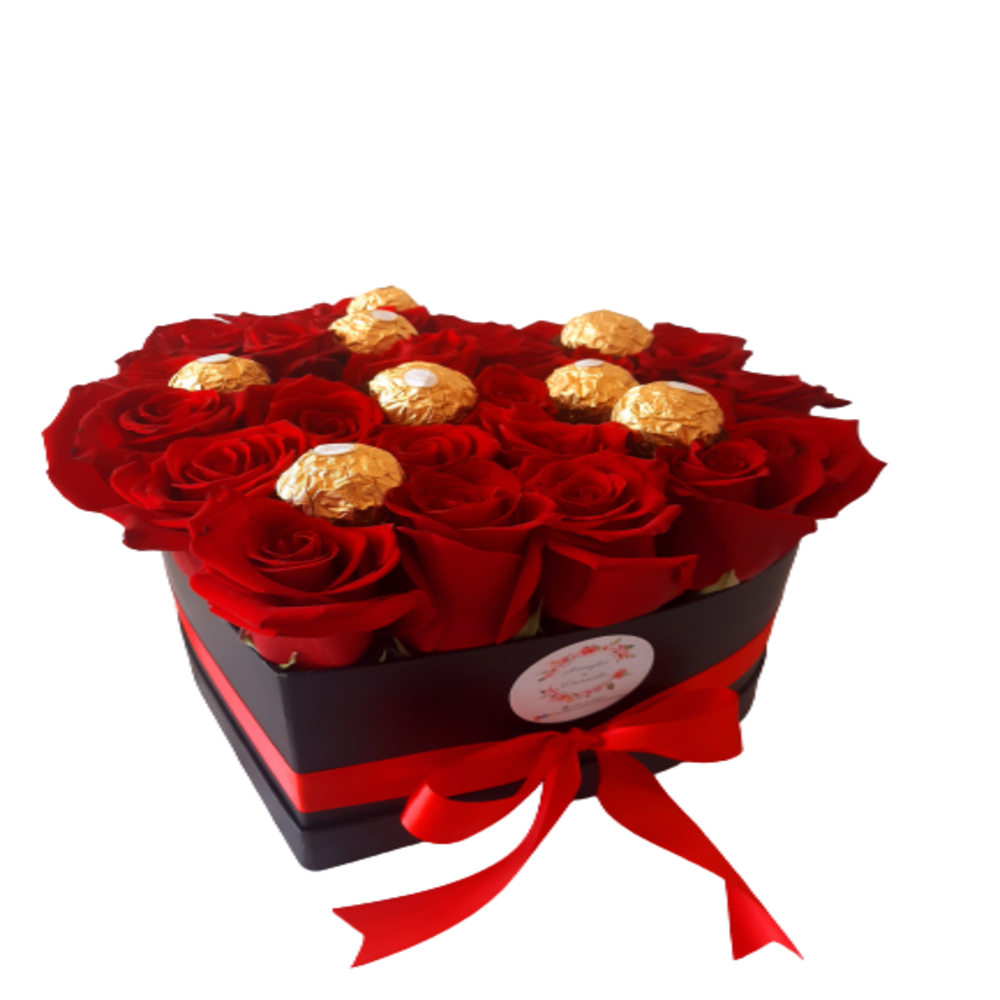 - Caja de 20 bellas Rosas mas chocolate Ferrero Rocher, la caja que abarca las Rosas son de elegantes terminaciones de cartón color negro, sujetada con una hermosa cinta santín roja.