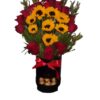 - Sorpréndela con esta espectacular caja de 8 rosas mas girasol. La caja que abarca las Rosas son de elegantes terminaciones de cartón color negro/blanco/rojo, sujetada con una hermosa cinta santín roja.