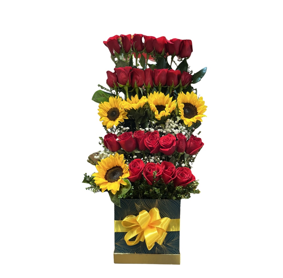Sorpréndela con esta espectacular caja con 25 Rosas Rojas y 5 girasoles . La caja que abarca las Rosas son de elegantes terminaciones de cartón blanca/negra, sujetada con una hermosa cinta santín amarilla