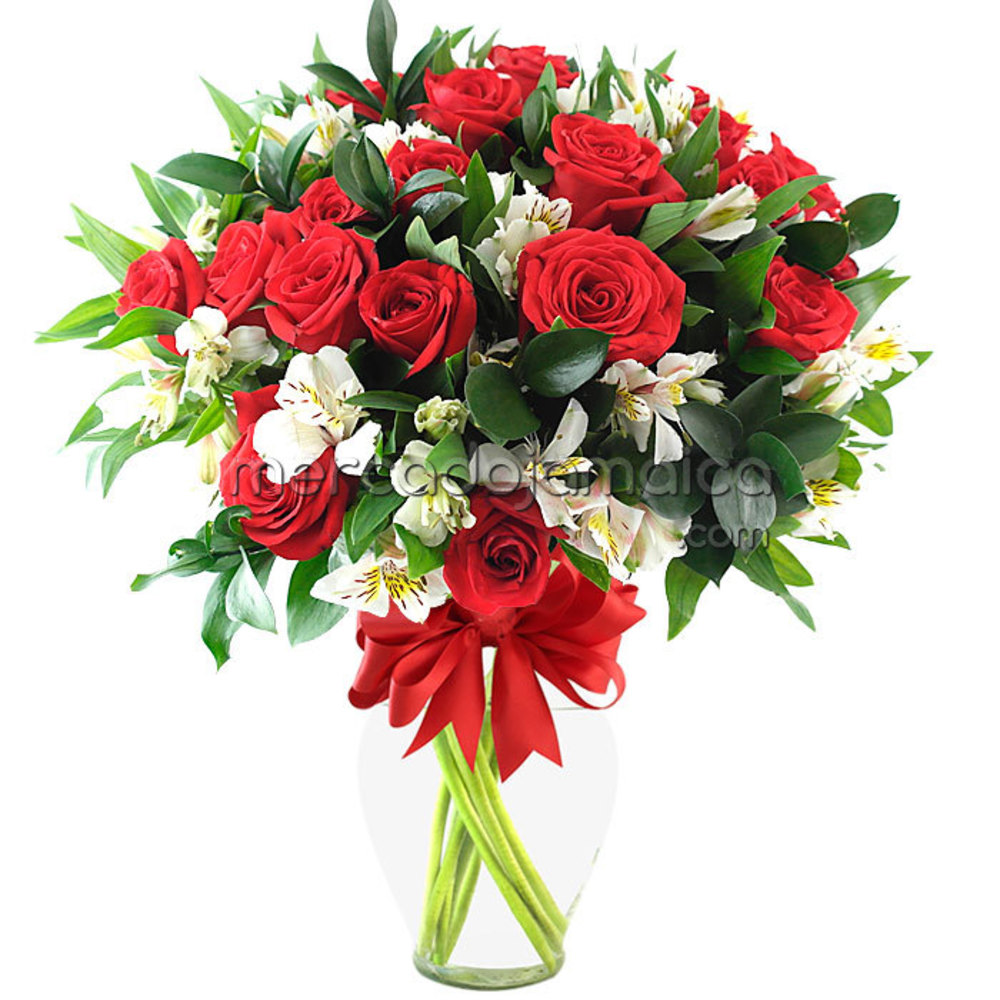- Florero de 24 Rosas rojas y altromerias. Este precioso ramo va en un delicado florero de vidrio transparente, adornado con una hermosa cinta roja que realza la belleza de este destacado Jarrón. Incorpora un tarjetón donde usted puede escribir el mensaje que desee.